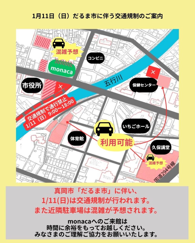 1/11(日)はだるま市に伴う交通規制があります。(規制時間 9:00~18:00)