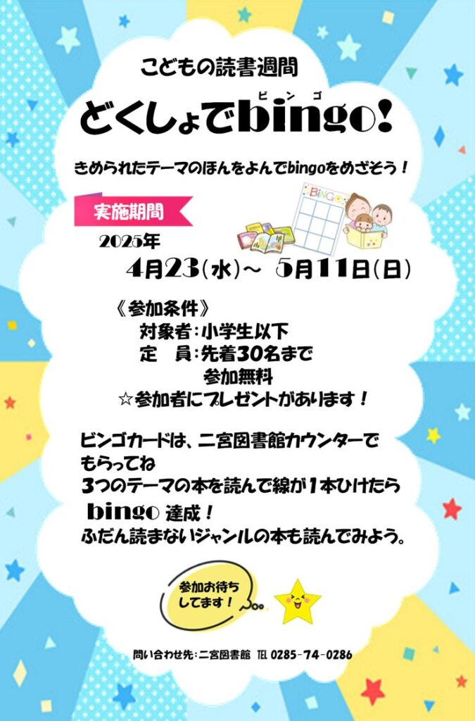 内容:いろいろなジャンルの本を読んでビンゴを達成しよう。参加賞もあるよ!