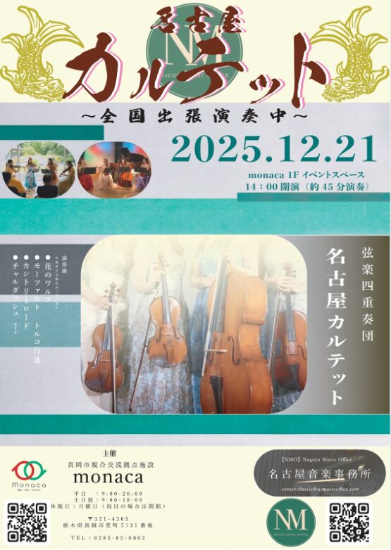 弦楽四重奏団『名古屋カルテット』による演奏会をmonacaで開催します♪