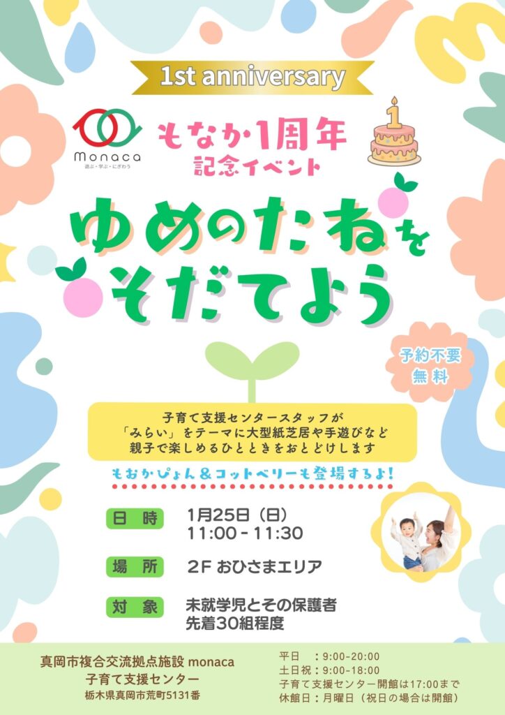 子育て支援センタースタッフが「みらい」をテーマに大型紙芝居や手遊びなど、親子で楽しめるひとときをおとどけします。