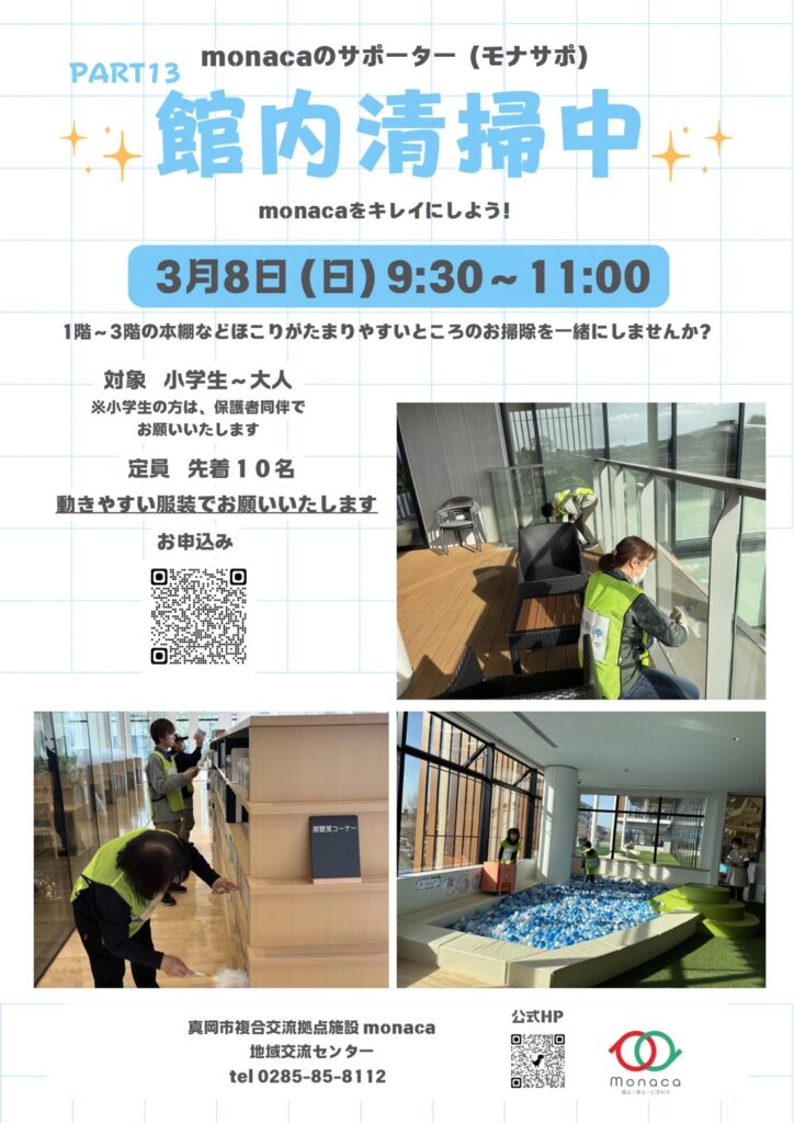 ホーム » イベント » 3月8日(日) モナサポ 館内清掃中