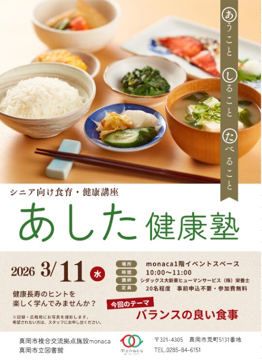 monacaでシニア向け食育・健康講座を開催します。健康長寿を支える「あうこと しること たべること」について、楽しく学びましょう!