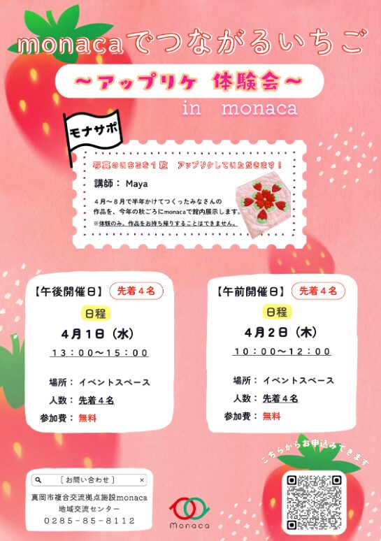 ホーム » イベント » 4月1日(水)・2日(木) monacaでつながるいちご~アップリケ体験会~ in monaca