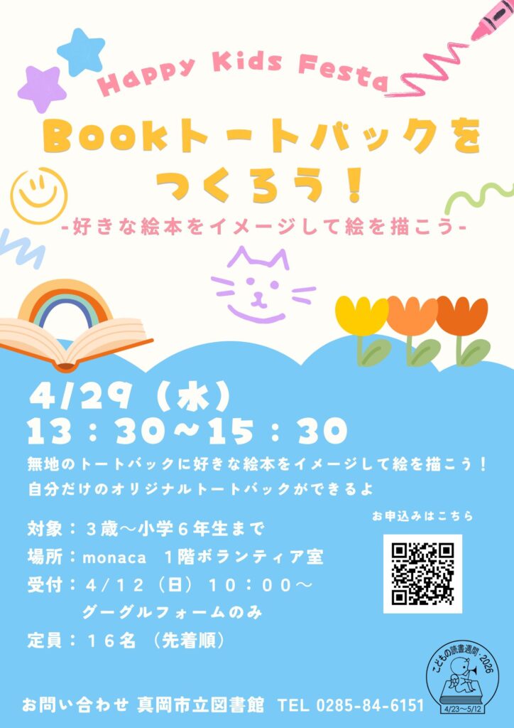 ホーム » イベント » 4月29日(水) こどもの読書週間「Bookトートバッグを作ろう!-好きな本をイメージして絵を描こう-」
