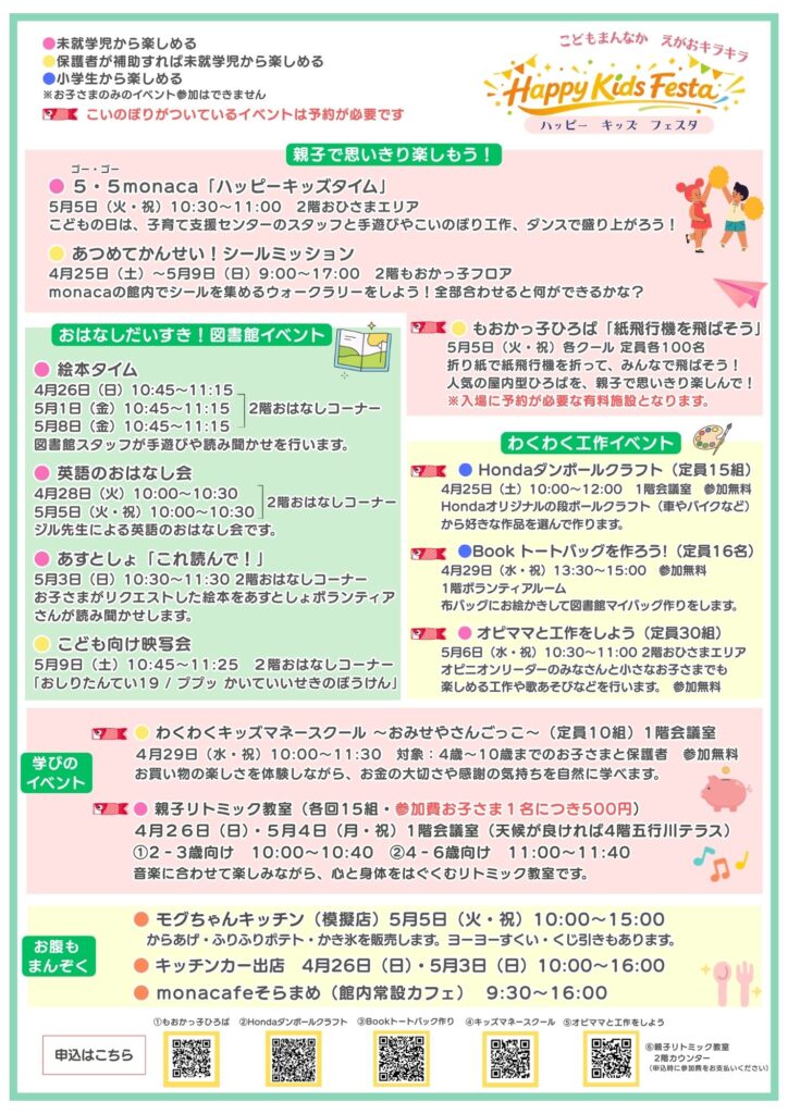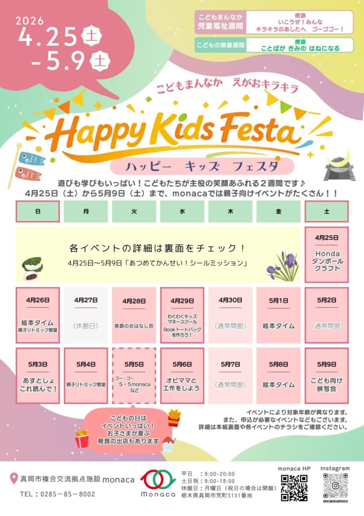 4月25日(土)から5月9日(土)まで、「こどもまんなか週間」と「こどもの読書週間」にあわせて、 遊びと学びがいっぱい詰まったHappy Kids Festaを開催します。