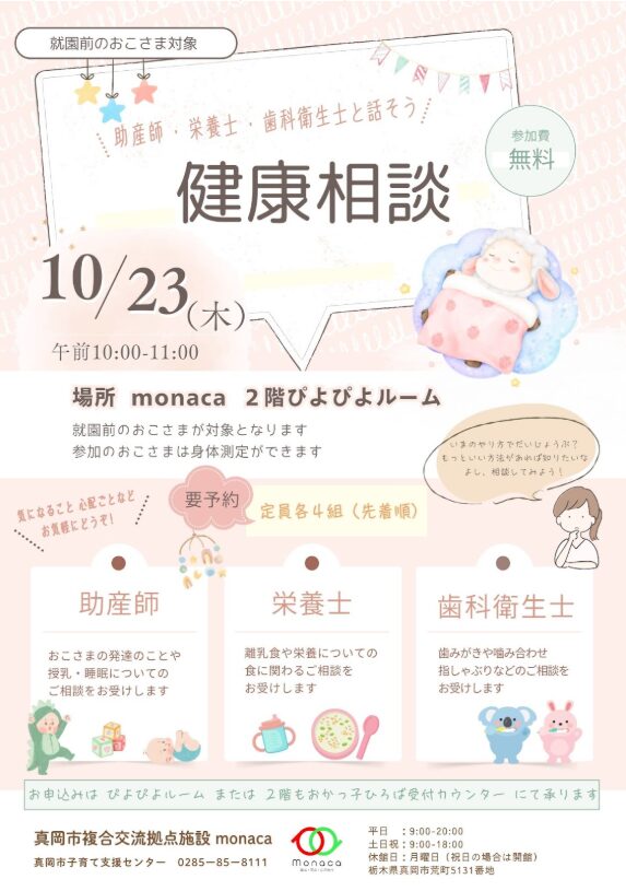 ※助産師、栄養士、歯科衛生士 定員各4組(先着順) 2階ぴよぴよルームまたは、もおかっ子ひろばの受付カウンターでご予約下さい。お電話でもご予約できます。