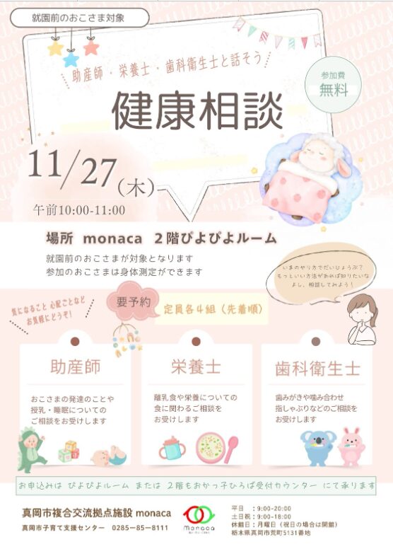 ※助産師、栄養士、歯科衛生士 定員各4組(先着順) 2階ぴよぴよルームまたは、もおかっ子ひろばの受付カウンターでご予約下さい。お電話でもご予約できます。