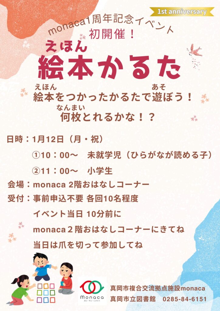 monacaで初開催!絵本のかるたで遊んでみませんか。新しい楽しい絵本が見つかるかも! 時間:①10:00~ 未就学児(ひらがなが読める子) ②11:00~ 小学生 場所:monaca 2階おはなしコーナー 事前の […]